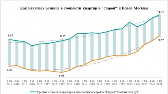 Разница в стоимости новых квартир в ТиНАО и «старой» Москве в 2020 году устойчиво сокращалась. В I квартале новомосковское жилье стоило 65% цены старомосковского, во II квартале – 72%, в III и IV квартале – 77%, наконец, в I квартале 2021 – 80%.