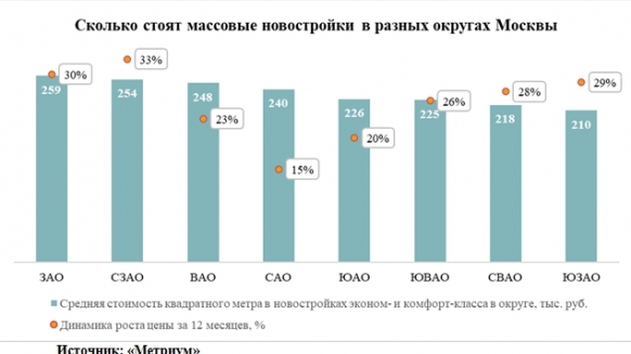 Только за прошедший месяц в среднем показатель цены во всех округах увеличился на 4%. За 12 месяцев сильнее всего подорожали новостройки в СЗАО – на 33%. Затем следует ЗАО (30%), ЮЗАО (29%), СВАО (28%), ЮВАО (26%), ВАО (23%), ЮАО (20%) и САО (15%). В абсолютном выражении квадратный метр в разных округах стал дороже на 30-60 тыс. рублей за год. В целом же по рынку новостроек Москвы стоимость массовых новостроек увеличилась за года на 25% – с 188 тыс. руб. за кв.м до 234 тыс. руб. за кв.м.