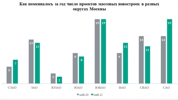 В мае 2021 года в Северном административном округе (САО) Москвы застройщики реализовывали 19 проектов массовых новостроек, тогда как год назад их было 14. По текущему числу ЖК САО потеснил постоянного лидера московского девелопмента экономичных комплексов – Юго-Восточный административный округ (ЮВАО), где реализуют 19 проектов, хотя этот показатель не изменился.