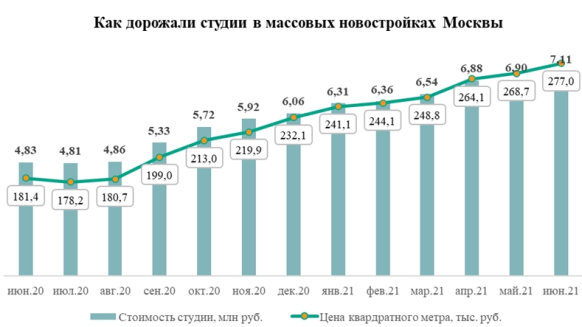 В июне 2021 года средняя стоимость студии в новостройках эконом- и комфорт-класса в Москве составила 7,11 млн рублей. По подсчетам экспертов «Метриум», за 12 месяцев такое жилье подорожало на 47%. Квадратный метр в студии сейчас стоит столько же, сколько «квадрат» в новостройках бизнес-класса в III квартале 2020 года. При этом новомосковские студии догоняют в цене старомосковские.