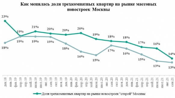 Похожая тенденция наблюдается и в Новой Москве. Здесь в сентябре застройщики продавали 9,8 тыс. квартир. Из них 1,3 тысячи – трехкомнатные. За прошедший квартал их число снизилось на 12%. Таким образом, сейчас на долю трехкомнатных квартир в Новой Москве приходятся 13% предложения жилья. Это всё еще больше, чем у студий (11%), но меньше, чем у однокомнатных квартир (41%) и двухкомнатных (34%). Два года назад трёхкомнатные квартиры составили 19% рынка, студии – 10%, однокомнатные квартиры – 30%, а двухкомнатные – 38%. Как и в «старой» Москве, в Новой Москве маленьких квартир становится больше, чем сравнительно больших.