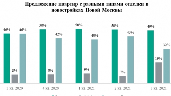 В ноябре 2021 года на рынке новостроек Новой Москвы застройщики предлагали покупателям 9,8 тыс. квартир. С отделкой white box при этом насчитывалось 1,9 тыс. лотов. Этот формат (еще он называется предчистовым ремонтом) предполагает наличие межкомнатных стен, подготовку поверхностей к косметическому ремонту и разводку коммуникаций. Между тем, в ноябре 2020 года девелоперы продавали 600 таких квартир. Соответственно, за год предложение жилья с предчистовой отделкой на первичном рынке Новой Москвы увеличилось более чем в три раза.