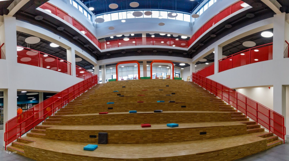 Проект ГК «А101» воплощает концепцию third place («третье место» после дома и работы). Многофункциональное пространство может использоваться как зал для занятий йогой и танцами, лекторий или площадка для концертов и музыкальной самодеятельности. Для этого здесь установлены зеркала и проектор для презентаций, выполнена акустическая подготовка с установкой звукового микшера для подключения микрофона и музыкальных инструментов.