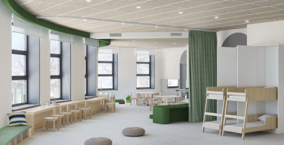 Каждая из 9 групп в детском саду «Лесной ручей» станет трансформируемой, что позволит или разделять спальную и игровую зоны, или объединить их, формируя пространство под различные активности. Кружковые помещения для развития интеллекта, мелкой моторики и образного мышления будут оснащены необходимыми игрушками и материалами для творческих занятий. Музыкальный зал будет оборудован для проведения концертов и праздников.