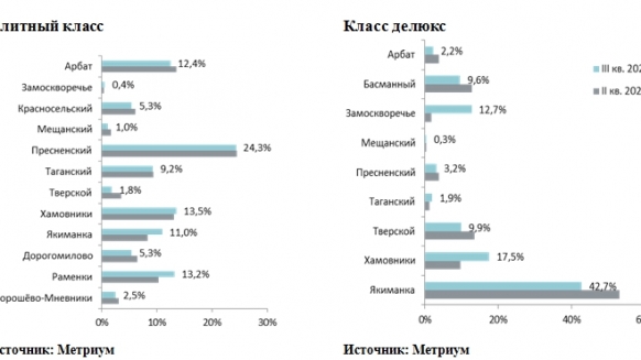 Среди районов Москвы по количеству элитных лотов в продаже со значительным отрывом лидирует Пресненский район (24,3%). Довольно велика доля районов Хамовники (13,5%), Раменки (13,2%) и Арбат (12,4%).