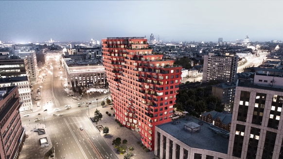 Первый «пиксельный» дом в Москве – это апарт-комплекс премиум-класса RED7 от ГК "Основа" на Садовом кольце (Красносельский район, ЦАО). Он удивляет необычными разветвленными и ступенчатыми формами, напоминающими тетрис. Когда обходишь этот дом, возникает ощущение трансформации его формы из M-образной в похожую на W. Стоит отметить, что нидерландские архитекторы проекта из бюро MVRDV позаимствовали цвет и некоторые элементы фасадов RED7 у расположенного напротив памятника конструктивизма – здания Наркомзема.