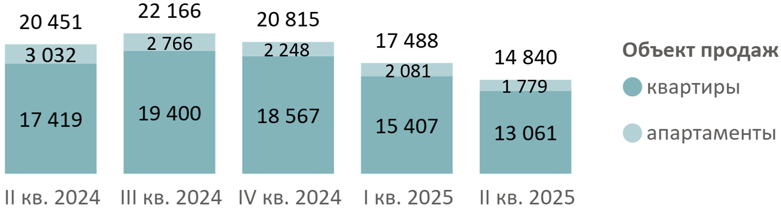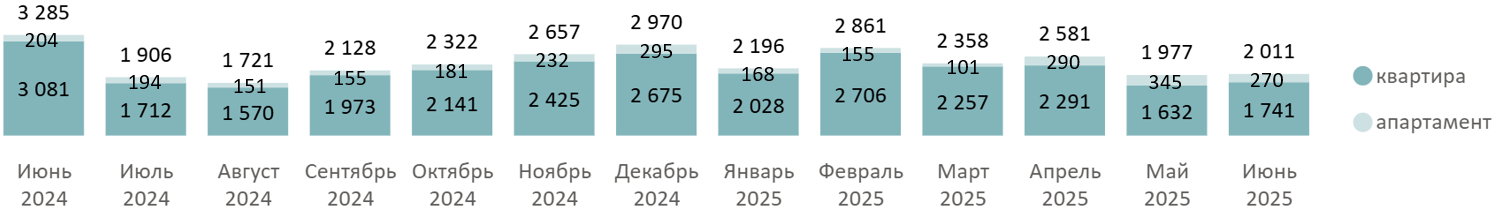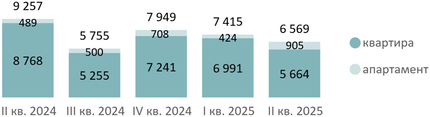 В I полугодии 2025 года на рынке новостроек массового сегмента было зарегистрировано 14,0 тыс. ДДУ (+2% за полугодие, -9,6% за год). Во II квартале 2025 года было заключено 6,6 тыс. ДДУ (-11,4% за квартал, -29,0% за год).