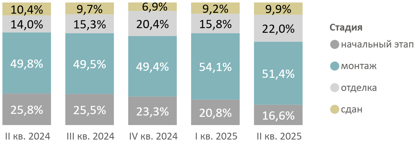 Из-за отсутствия новых проектов массового сегмента в структуре предложения по стадии строительной готовности за полугодие сократилась доля предложения на начальном этапе строительства (16,6%, -6,7 п.п. за полугодие). А на стадии монтажа этажей (51,4%, +2 п.п.), на стадии отделки (22%, +1,6 п.п.) и в сданных корпусах (9,9%, +3 п.п.) доля предложения выросла.