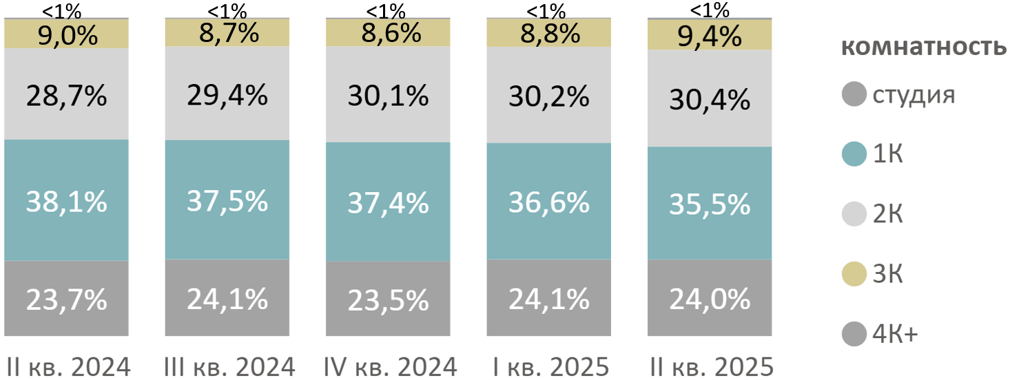 В распределении предложения по типологии за I полугодие выросла доля предложения трехкомнатных (30,4%, +0,3 п.п.), многокомнатных (9,4%, +0,8 п.п.) помещений, а также студий (24,0%, +0,5 п.п.). В свою очередь, доля однокомнатных квартир и апартаментов сократилась на 1,9 п.п. и составила 35,5%.