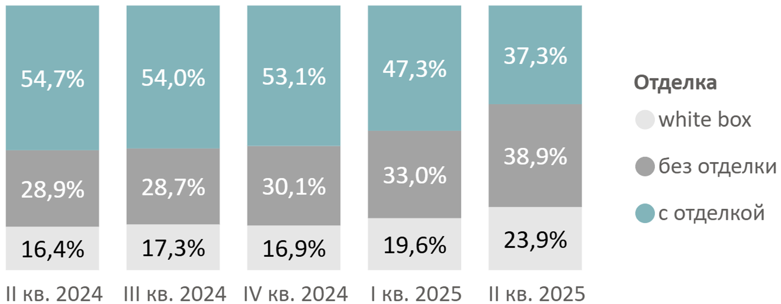 В структуре предложения по типу отделки продолжается тенденция к сокращению доли предложения с чистовой отделкой (37,3%, -15,8 п.п. за полугодие) и росту доли предложения без отделки (38,9%, +8,8 п.п.) и с отделкой white box (23,9%, +7 п.п.).