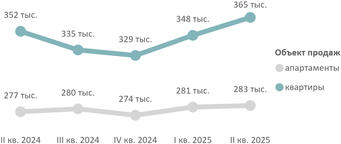 По подсчетам аналитиков «Метриум», средневзвешенная цена квадратного метра квартир и апартаментов по итогам I полугодия 2025 года составила 356 170 руб. (+4,5% за квартал, +9,9% за полугодие, +4,0% за год). Средневзвешенная цена квартир – 364 760 руб. за кв. м (+4,8% за квартал, +10,7% за полугодие, +3,7% за год), апартаментов – 282 910 руб. за кв. м (+0,5% за квартал, +3,3% за полугодие, +2,1% за год).