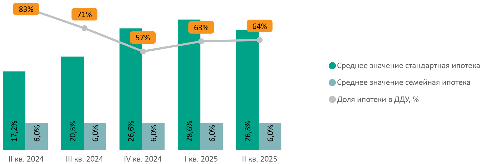 Доля сделок с привлечением ипотечного кредита в I полугодии составила 64% (+7 п.п. за полугодие, -14 п.п. за год). Средняя ставка по рыночной ипотеке за II квартал сократилась на 2,3 п.п. до 26,3%, а в начале июля достигла 24,5%.