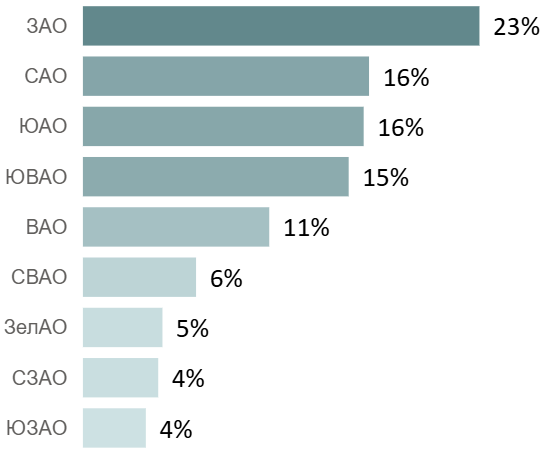 В I полугодии максимальное число сделок было зарегистрировано в ЗАО (23%, +5 п.п. за полугодие), второе место по числу сделок приходится на САО (16%, +2 п.п.), третью позицию занимает ЮАО (16%, +3 п.п.). По объему продаж в I полугодии лидируют «Бусиновский парк» (826 ДДУ), «Москворечье» (802 ДДУ), «Движение. Говорово» (789 ДДУ).