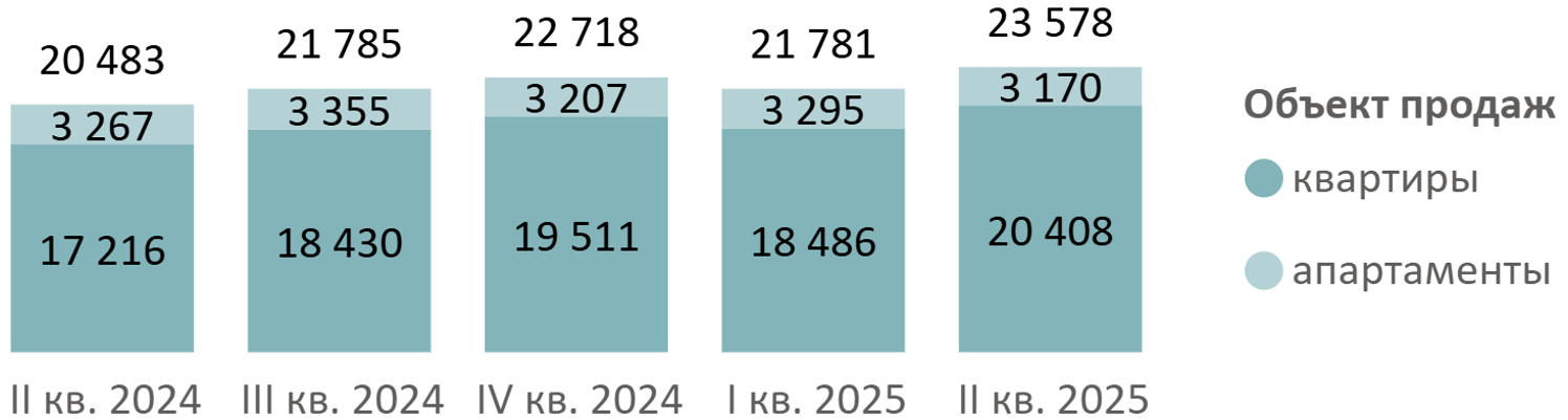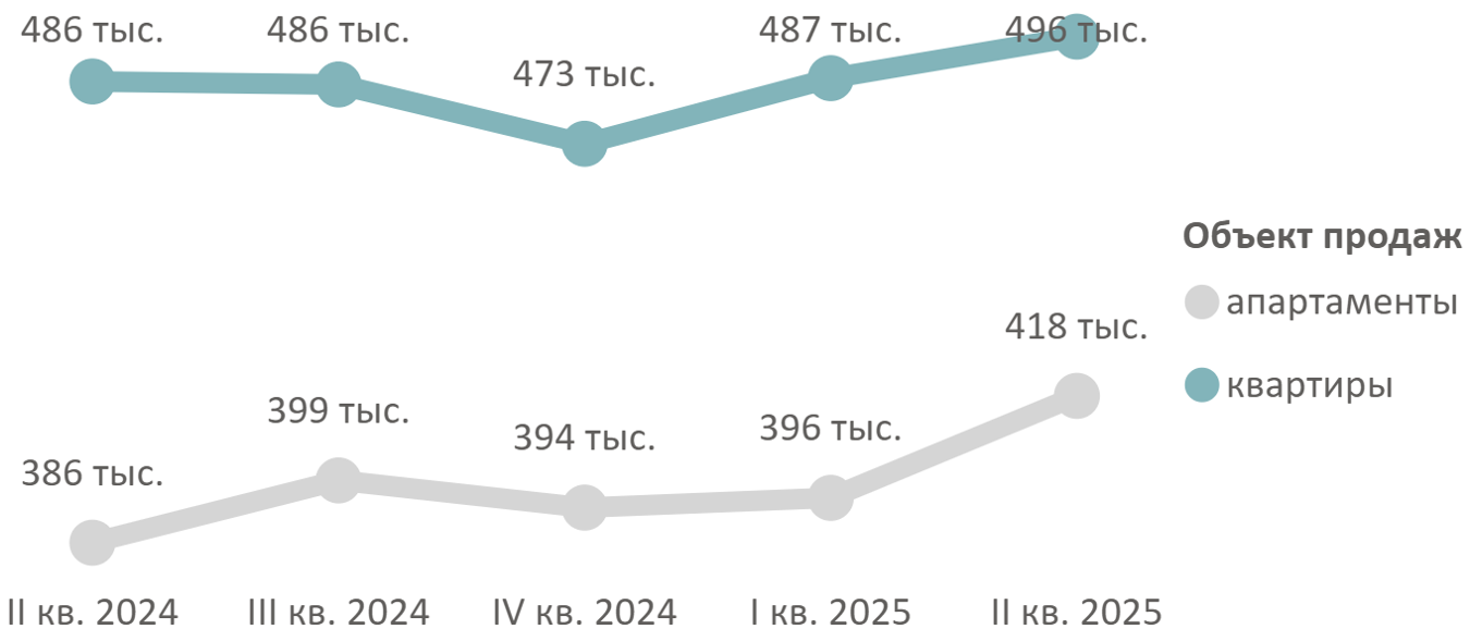 По подсчетам аналитиков «Метриум», средневзвешенная цена квадратного метра квартир и апартаментов по итогам I полугодия 2025 года составила 486 720 руб. (+2,5% за квартал, +5,1% за полугодие, +3% за год). Средневзвешенная цена квартир – 496 090 руб. за кв. м (+4,9% за полугодие, +2,0% за год), апартаментов – 417 860 руб. за кв. м (+6,2% за полугодие, +8,3% за год).