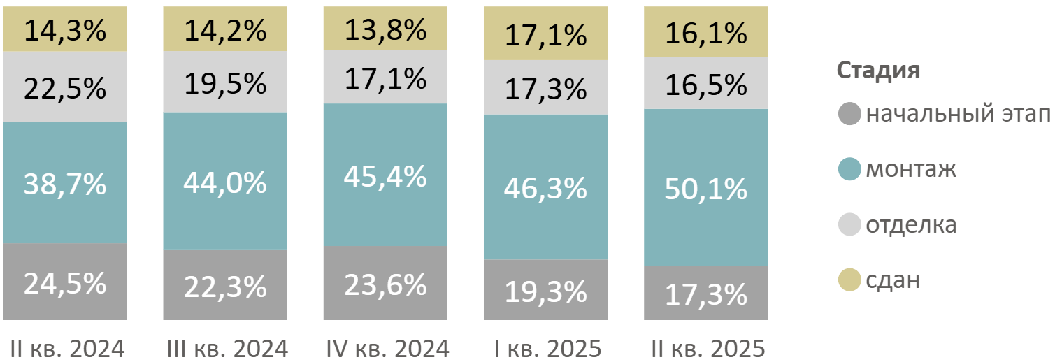 В структуре предложения по стадии строительной готовности за I полугодие выросла доля предложения в сданных корпусах (16,1%, +2,3 п.п.) и в корпусах на этапе монтажа этажей (50,1%, +4,7 п.п.). В корпусах на стадии отделки (16,5%, -0,6 п.п.) и на начальном этапе (17,3%, -6,3 п.п.) доля предложения сократилась.