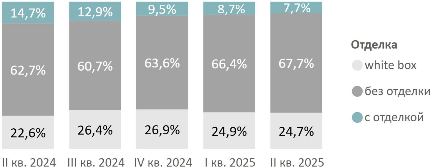В структуре предложения по типу отделки сохраняется тенденция к росту доли предложения без отделки (67,7%, +4,1 п.п. за полугодие) на фоне стабильного сокращения доли предложения с чистовой отделкой (7,7%, -1,8 п.п.). В формате white box девелоперы предлагают 24,7% лотов (-2,2 п.п.).