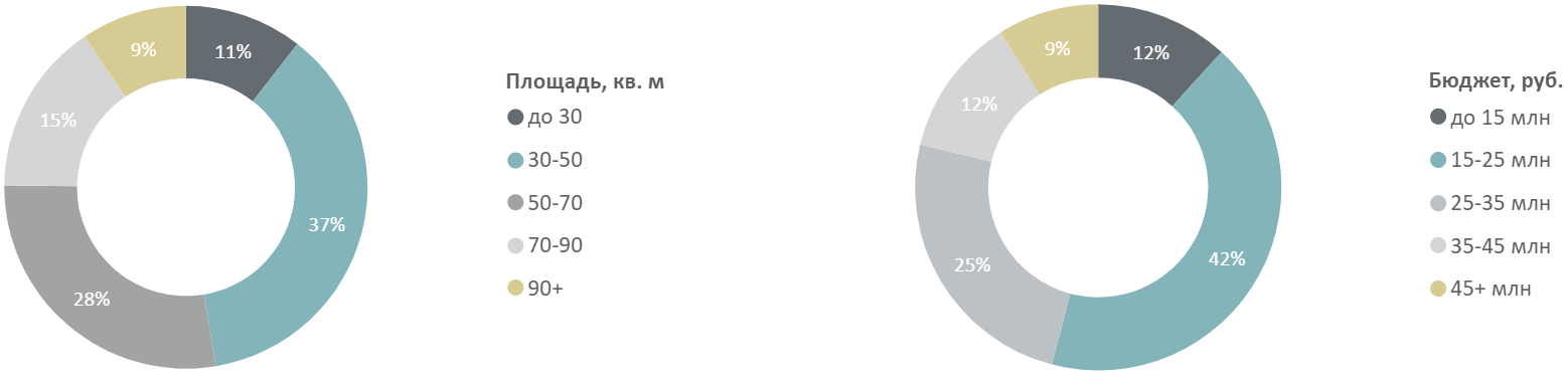 Распределение предложений на первичном рынке недвижимости бизнес-класса по площадям и бюджетам, количество лотов