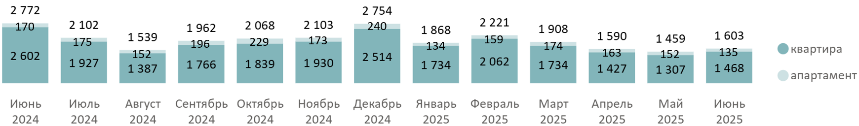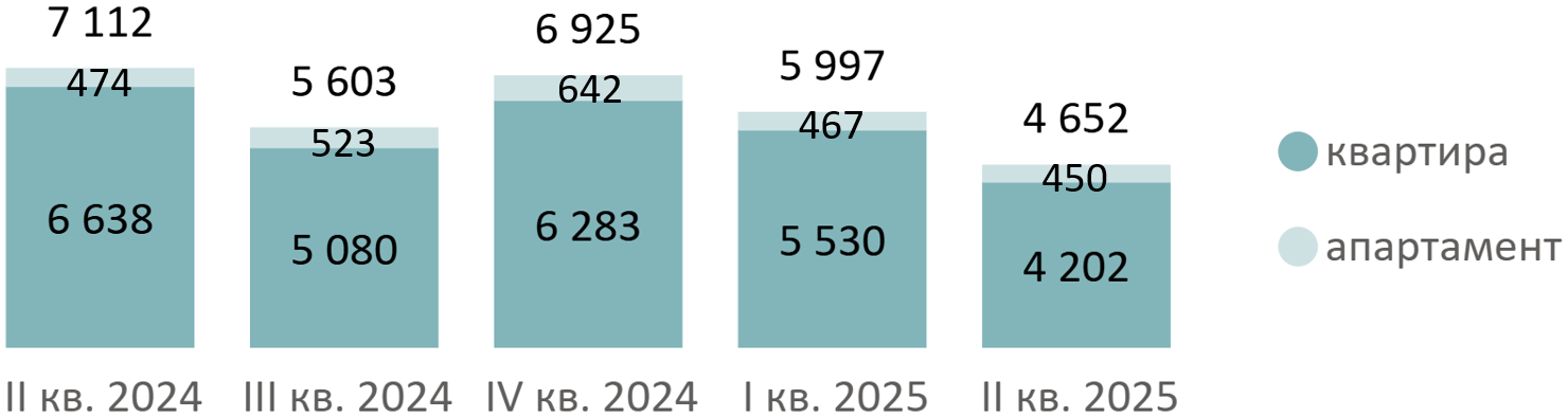 В I полугодии 2025 года на рынке новостроек бизнес-класса было зарегистрировано 10,6 тыс. ДДУ (-15,0% за полугодие, -12,5% за год). Несмотря на квартальный рост предложения, во II квартале 2025 года было заключено на 22,4% меньше ДДУ, чем в предыдущем квартале (4,6 тыс. ДДУ, -34,6% за год).