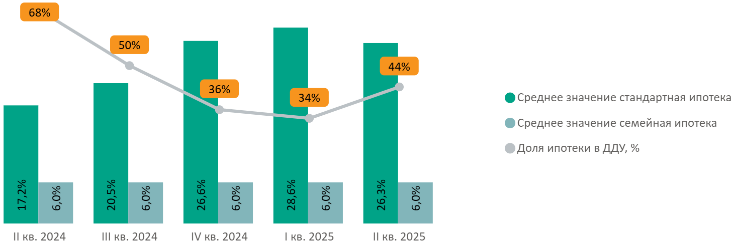 По итогам I полугодия 2025 года доля сделок с ипотекой на рынке новостроек бизнес-класса сократилась до 38%, что на 5 процентных пунктов ниже показателя предыдущего полугодия. Квартальная динамика демонстрирует рост показателя: во II квартале доля ипотечных сделок выросла до 44%, увеличившись на 10 п.п. по сравнению с I кварталом.