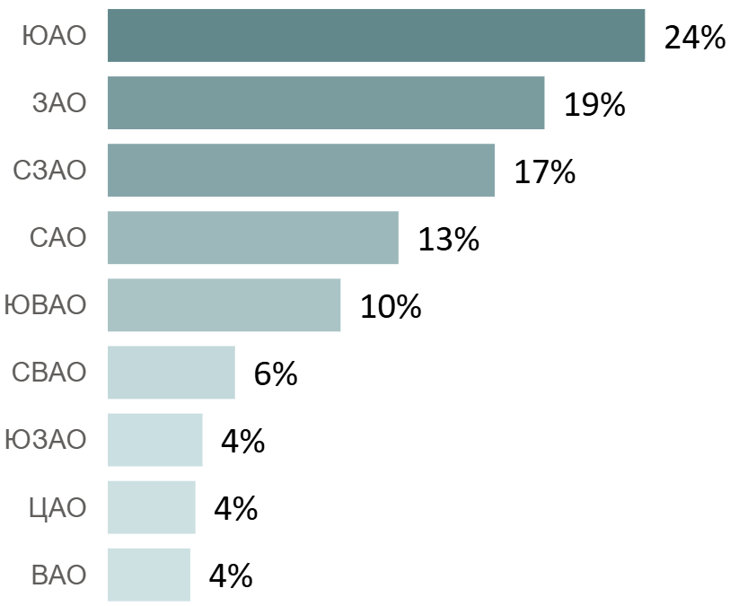 Максимальный объем предложения представлен в ЮАО (4,7 тыс. шт.). За полугодие объем предложения сократился только в трех округах: ЦАО (0,7 тыс. шт., -15%), ЮЗАО (1,6 тыс. шт., -12%), ЗАО (3,5 тыс. шт., -11%).
