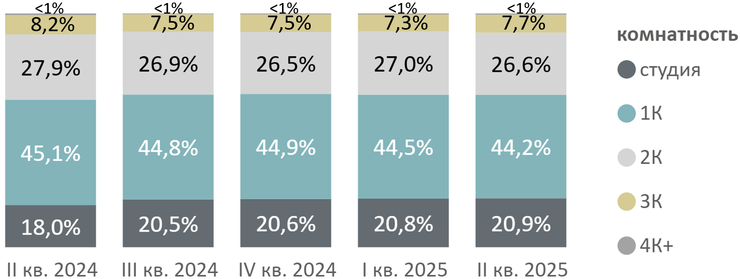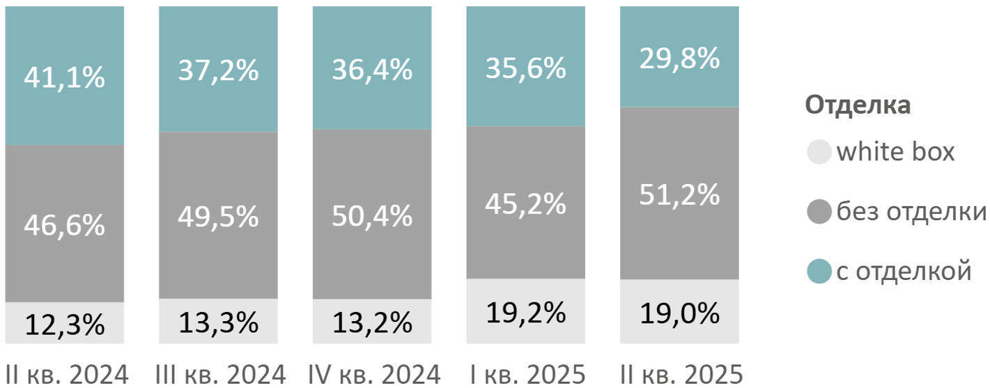 За полугодие не было отмечено значительных изменений в структуре предложения по стадиями строительной готовности, однако в годовом сопоставлении наблюдается тенденция к сокращению доли предложения на начальном этапе строительства (13,6%, -7,6 п.п. за год) на фоне замедления темпов вывода на рынок новых проектов.
