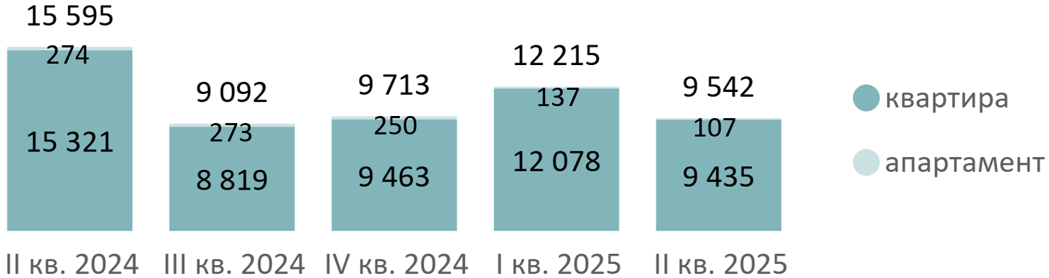 В I полугодии 2025 года на рынке новостроек Московской области было зарегистрировано 21,8 тыс. ДДУ (+15,7% за полугодие, -13,5% за год). Во II квартале 2025 года было зарегистрировано 9,5 тыс ДДУ (-21,9% за квартал, -38,8% за год).