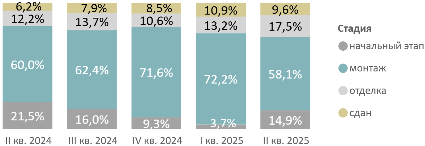 В структуре предложения по стадии строительной готовности выросла доля предложения, а корпусах на начальном этапе (14,9%, +5,6 п.п. за полугодие), на этапе отделки (17,5%, +6,9 п.п.) и в сданных корпусах (9,6%, +1,1 п.п.). Доля предложения в корпусах на этапе монтажа этажей сократилась (58,1%, -13,5 п.п.).