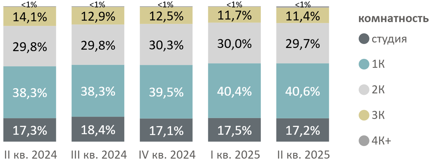В распределении по типологии выросла доля предложения однокомнатных квартир и апартаментов (40,6%, +1,1 п.п. за полугодие) и сократилась доля предложения трехкомнатных форматов (11,4%, -1,1 п.п. за полугодие). В целом, в структуре предложения по типологии не было отмечено значительных изменений.