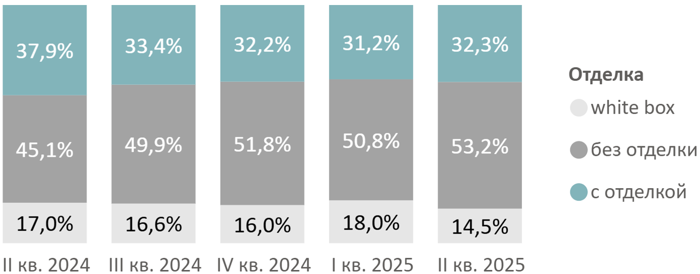В распределении предложения по типу отделки сохраняется тенденция к росту доли предложения без отделки (53,2%, +1,4 п.п. за полугодие). Доля предложения с чистовой отделкой практически не изменилась (32,3%, +0,1 п.п.), а доля предложений в формате white box сократилась (14,5%, -1,5 п.п.).