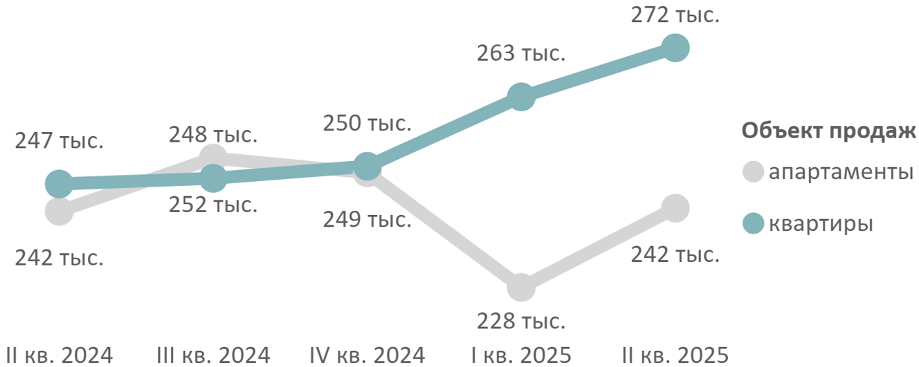 По подсчетам аналитиков «Метриум», средневзвешенная цена квадратного метра квартир и апартаментов по итогам I полугодия 2025 года составила 271 510 руб. (+3,4% за квартал, +8,6% за полугодие, +10,1% за год). Средневзвешенная цена квартир – 271 990 руб. за кв. м (+8,8% за полугодие, +10,2% за год), апартаментов – 242 260 руб. за кв. м (-2,6% за полугодие, +0,2% за год).