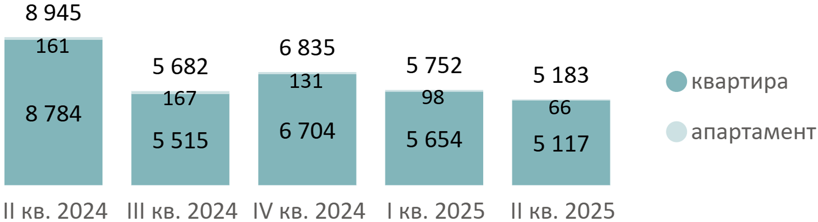 В I полугодии 2025 года на рынке новостроек Новой Москвы было зарегистрировано 10,9 тыс. ДДУ (-12,6% за полугодие, -22,0% за год). Во II квартале было отмечено 5,2 тыс. ДДУ (-9,9% за квартал, -42,1% за год).