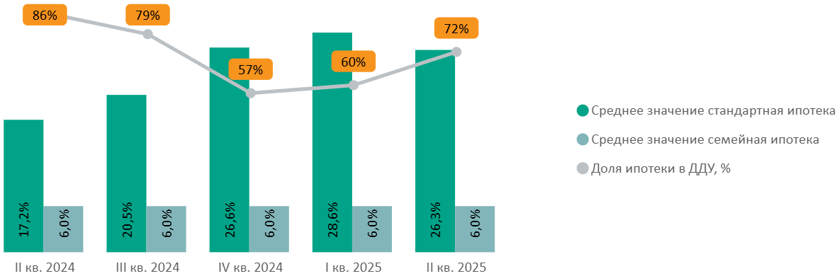Доля ипотечных сделок ко II кварталу 2025 года достигла 72% – это выше показателей двух предыдущих кварталов.
