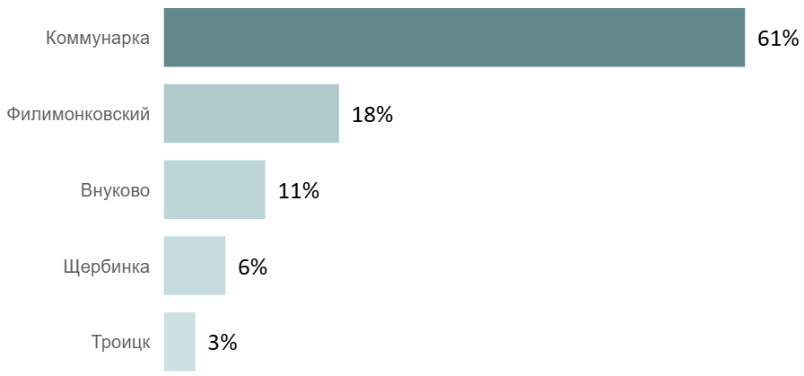 Среди районов максимальное число сделок было зарегистрировано в Коммунарке (61%, +5 п.п. за полугодие). По продажам в I полугодии лидируют: «Саларьево парк» (2 088 ДДУ), «Бунинские кварталы» (850 ДДУ) и «Скандинавия» (727 ДДУ).