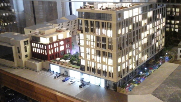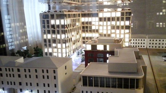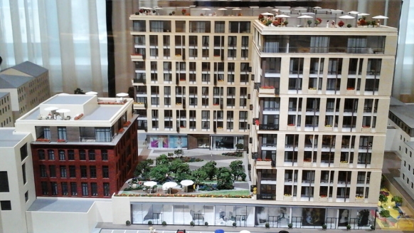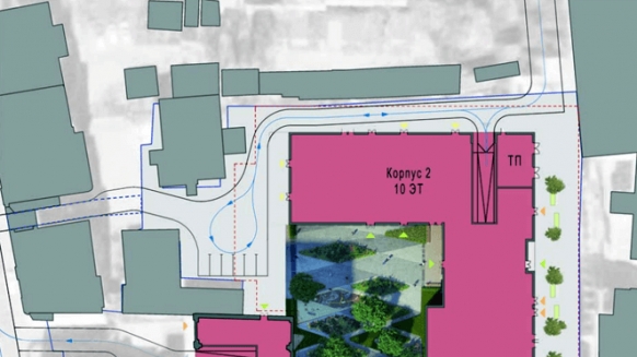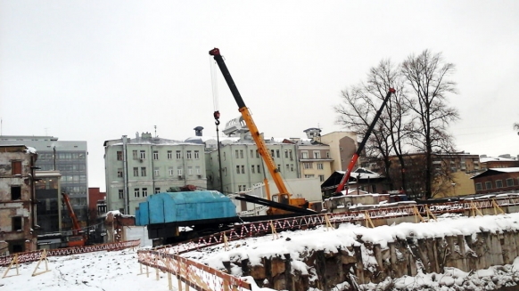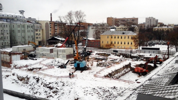 Обратите внимание на полуразрушенный четырехэтажный домик слева, его видно и на фото выше. Там, где сейчас вырыт котлован будет десятиэтажный, я бы сказала, основной дом, выполненный в стиле минимализма, а на месте этих развалин построят здание в пять этажей, которое будет отличаться по стилистике от модернового большого здания. Пятиэтажный корпус с широким шагом оконных проемов стилизован под образец промышленной архитектуры 19 века и облицован красным кирпичом.