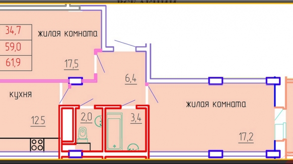 Двухкомнатная 61,9 кв. м. участвующая в акции стоит 2 950 000 рублей (47 000 за квадратный метр). Такая же, но без скидки 3 800 000 рублей.