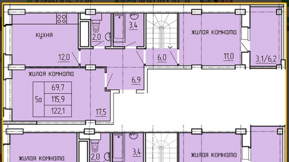 Пятикомнатная двухэтажная квартира в 122,1 кв. м – такие находятся на верхнем этаже и показались мне очень интересными. Они тоже есть продавались по акции и при стоимости 45 000 рублей за квадратный метр, их можно было купить за 5 494 000 рублей. Полная стоимость вне акции – 6 250 000 рублей.