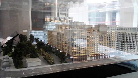 На макете в офисе на переднем плане: справа здание АО «МКБ «Искра», слева апартаменты, и на заднем плане видны верхние этажи офисно-делового центра. Вид со стороны улицы Шапошникова.