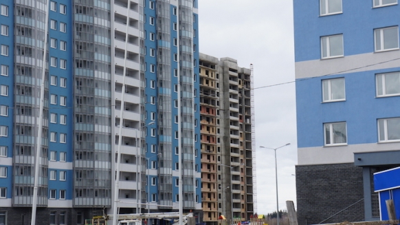 С этого края стали хорошо видны ещё два возведённых корпуса второй очереди. Это одноподъездная 17-этажная башня на 160 квартир и такой же, как дома первой очереди, голубой дом на 288 квартир. Цвета, правда, он ещё не приобрёл (отделка фасадов начнётся, скорее всего, уже летом). Сдача этих домов Государственной комиссии анонсирована на финал 2018 года. Стройка движется, но даже стеклопакеты пока не установлены.