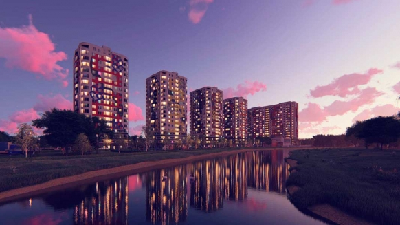 ЖК «Весна» – проект более масштабный, чем предыдущие работы компании. В начале две тысячи двадцатых годов в северной части Ивантеевки, через дорогу от городского парка культуры и отдыха, на извилистом берегу реки Уча должны появиться четыре односекционных дома, один двухсекционный, открытая парковочная площадка, здание поликлиники и корпус торгового центра.
