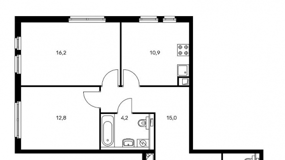 Двухкомнатная квартира общей площадью 65,8 кв. м выводит владельца прямо-таки на оперативный простор. Прихожая 15 кв. м и гардеробная 6,6 кв. м, два полноценных санузла с ванной или душевой кабиной, 11-метровая кухня, да еще две спальни по 12,8 и 16,2 кв. м. Причем, та, что побольше – с двумя окнами. Возможно, в этой квартире не так уж много места для мебели, но света в ней точно будет достаточно.