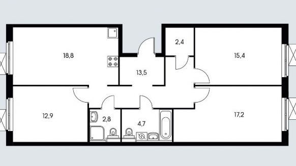 Трехкомнатная квартира общей площадью 87 кв. м относится к категории «распашонка». Ее окна выходят на две стороны света, значит, при любом расположении дома солнышко попадет внутрь вашего жилья. Большая прихожая, кладовка, два санузла с ванной или душевой кабиной – еще один плюс для большой семьи. Кухня почти 19 квадратов – да тут и для гостей найдется место, есть где поставить большой стол. А для отдыха три спальни в 12,9, 15,4 и 17,2 кв. м.