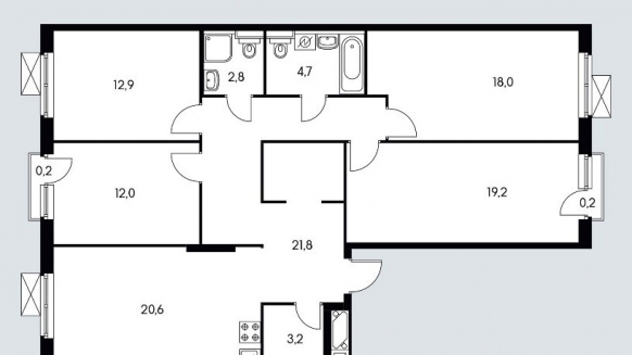 Четырехкомнатная квартира общей площадью 115,6 кв. м радует просторными помещениями и удобством их расположения. Входишь в квартиру и сразу попадаешь на кухню, точнее в коридор площадью 21,8 кв. м, не имеющей общей стены с кухней. Слева о кладовая 3,2 кв. м, далее по ходу – еще одна, почти такого же размера (назовем ее гардеробной). Кухня более 20 квадратов, два полноценных санузла и четыре спальни в 12,0, 12,9, 18,0 и 19,2 кв. м. Причем две из них с «французскими» балконами.
