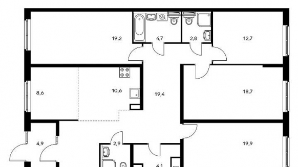 Еще один вариант 4-комнатной квартиры общей площадью 136 кв. м позволит членам большой семьи наслаждаться удобством и свободой передвижения. Потому что одна только прихожая и коридор в сумме дают 24,3 кв. м! Кухня, спроектированная в европейском формате, то есть без стены, отделяющей кухню от коридора – 19,2 кв. м. Кладовая, три санузла с ванной или душевыми кабинами и четыре спальни (12,7, 18,7, 19,2 и 19,9 кв. м) лишь дополняют ощущение комфорта.