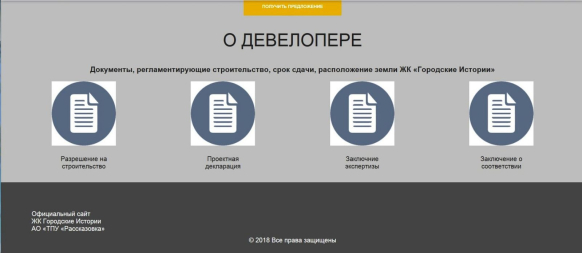Сайт новостройки в Интернете выглядит довольно скромно: https://gorhistory.ru/. Здесь мы найдем информацию о расположение объекта, более чем скромную фотогалерею, планировки квартир (без указания цен), строчку про рассрочку и ипотеку и раздел «о девелопере», заполненный только строительной документацией. Да и той всего четыре файла: разрешение на строительство, проектная декларация, заключение экспертизы, заключение о соответствии.