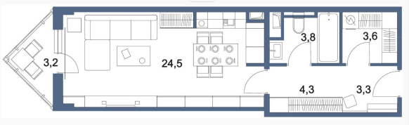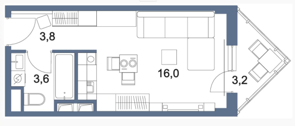 Однокомнатные квартиры в корпусах-башнях отличаются оригинальными небольшими треугольными балконами, достаточными для установки небольшого столика и пары стульев. В сочетании с панорамным остеклением такой балкон может стать прекрасным местом для отдыха. По сути дела, обе представленные планировки можно отнести к типу «студия», но на сайте застройщика они представлены как однокомнатные квартиры. Естественно, что в таких малогабаритных квартирах санузел сделан совмещенным и размер входной зоны сведен к минимуму. Зато в некоторых вариантах планировки есть кладовая, в которой найдется место и стиральной машине.