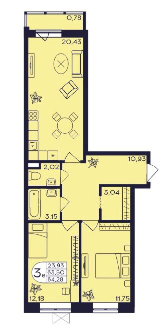 Планировки классических трехкомнатных квартир фактически клонированы и отличаются только по площади, причем разница едва уловима, исчисляется в сантиметрах. 67,54 - 68,2 - 68,73 - вот такая разница. Большая кухня площадью 10,7 кв.м. имеет два входа - из прихожей и из гостиной. В гостиной три окна, а значит, гостям будет в три раза светлее вести дружеские беседы с хозяевами. Спальни небольшие, от 10,62 до 14,36 кв.м. Санузел раздельный, гардеробная и балкон - в наличии.