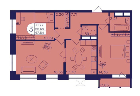 Планировка трехкомнатной квартиры 67,54