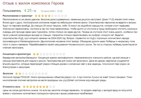 Но вот с точки зрения инфраструктуры не все радует. Нет полклиники в шаговой доступности, нет многоуровневых парковок, а парковочные места по периметру зданий все чаще становятся дефицитом. Экологические проблемы в виде гигантской свалки по соседству. Да и общая ситуация с жизненным пространством в растущем Железнодорожном не слишком благоприятная. Высотная застройка вбрасывает в городскую среду все новых и новых жителей, поэтому места для прогулок и уединения почти не остается. Ну и ладно, ведь для героев главное - достижение цели, победа над трудностями. И если ваша цель - недорогая квартира недалеко от Москвы, то вам сюда. А экология - на востоке от столицы она везде плохая.