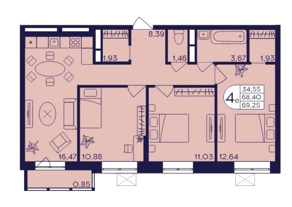 Планировка четырехкомнатной квартиры евро 69,25