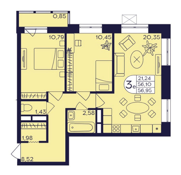 Планировка трехкомнатной квартиры евро 56,95